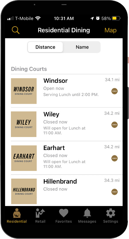 View open dining locations near you with the Purdue Mobile Menus map feature.